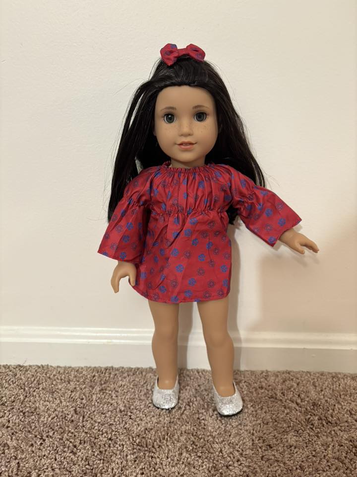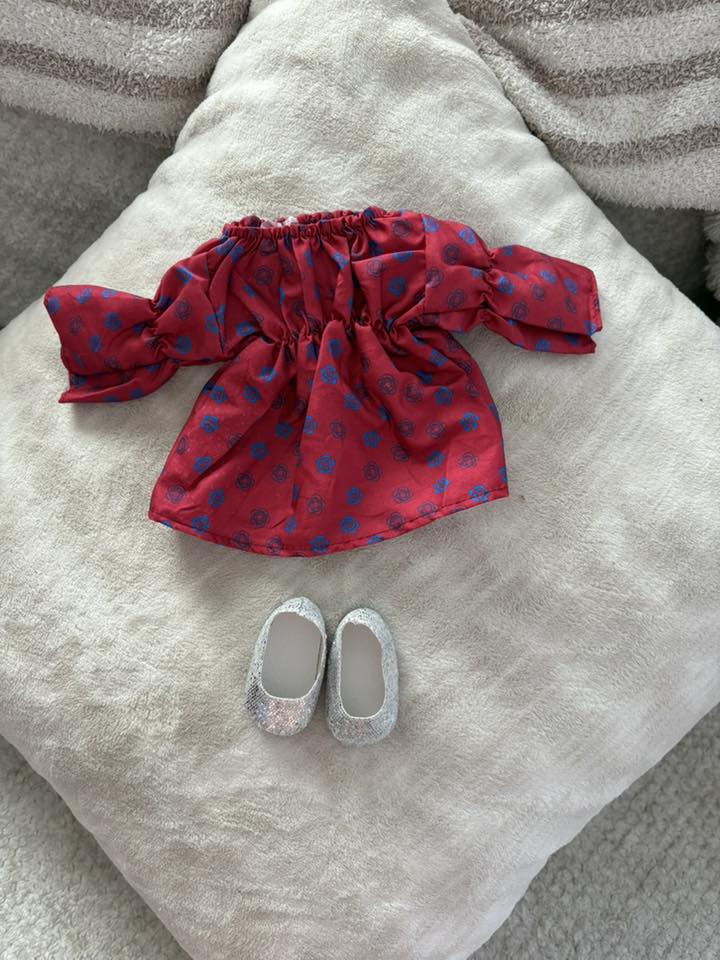 Red mini-dress with blue roses & silver flats, along with a matching hair clip. Doll not included.